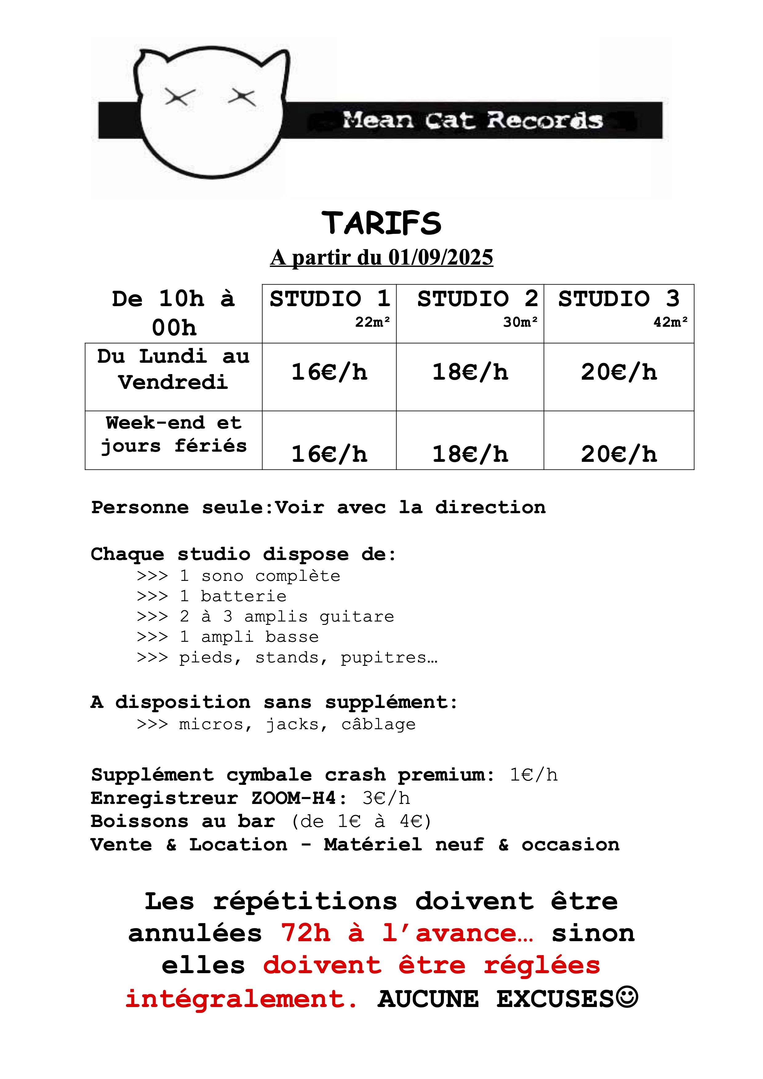 Chaque studio dispose d’une sono complète, d’une batterie complète 5 fûts et cymbales, de 3 amplis guitare à lampes, d’un ampli basse, de micros chants (Pieds perches et pied droit), d’un stand clavier et d’un pupitre.